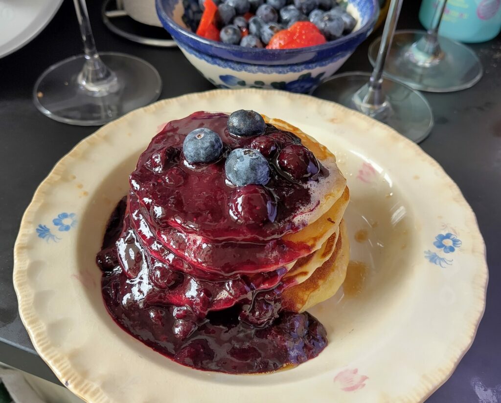 Dieses Rezept ist weniger süß als viele andere Pancake-Rezepte. Das liegt an meiner Vorliebe für große Mengen von Ahornsirup und Fruchtsauce.